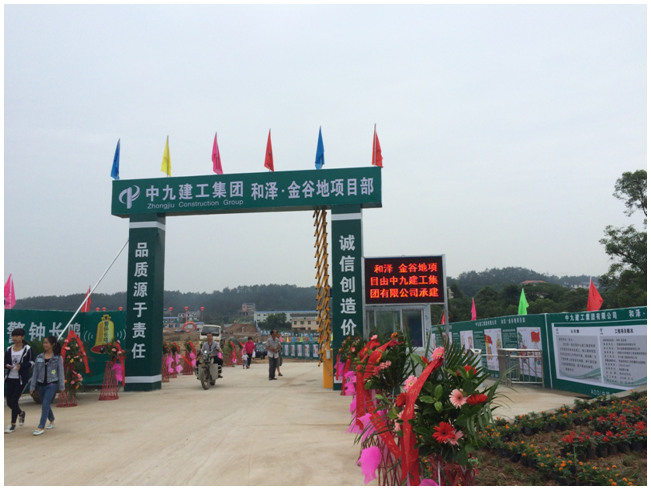 “和泽·金谷地”项目于2015年4月15日签定施工合同,公司随即成立了“和泽·金谷地”项目部,搭建了项目管理班子,紧急开展项目施工前期准备工作,现已完成施工现场大门、围挡、场内道路、办公室及食堂等修建、搭设工作。