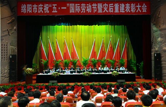 绵阳市庆祝“五一”国际劳动节暨灾后重建表彰大会于4月26日在“八一剧院”隆重举行。市委书记、市人大常委会主任吴靖平,市委副书记、市长曾万明等市领导参加表彰大会。